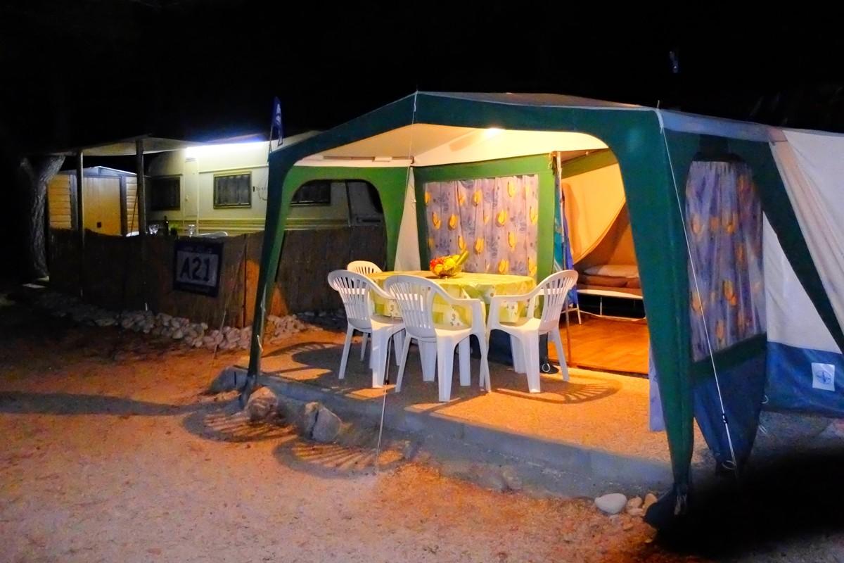 | STANY JSOU UMÍSTĚNY V NEPRŮCHOZÍ ČÁSTI KEMPU V PŘÍRODNÍM PROSTŘEDÍ VE STÍNU POD BOROVICEMI PŘÍMO NAD NÁDHERNOU OBLÁZKOVOU PLÁŽÍ. Po pobřeží se dále nacházejí menší "soukromé" a NUDISTICKÉ přírodní oblázkové pláže umístěné mezi skalami. Aktivní vyžití v kempu: 4 placené tenisové kurty s betonovým povrchem, možnost cvičení aerobiku. Zařízené stany pro 2-6 osob mají k dispozici 2 oddělené ložnice s pevnými lůžky a kuchyňku se základním nádobím a vybavením. Stany jsou vybaveny elektřinou, lednicí, 2-plotýnkovým vařičem, základním nádobím (hrnce, pánev, talíře, příbory, nůž, vařečka, naběračka, struhadlo, misky, sklenice, hrníčky, prkénko aj.), polštáři a přikrývkami a verandou s plastovým nábytkem. |