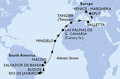 | 1. den,Rio de Janeiro, Brazílie, (připlutí: --:-- | odplutí: 18:00)2. den,Búzios, Brazílie, (připlutí: 08:00 | odplutí: 17:00)3. den,Relaxační den na moři4. den,Salvador, Brazílie, (připlutí: 09:00 | odplutí: 17:00)5. den,Maceio, Brazílie, (připlutí: 10:00 | odplutí: 19:00)6. den,Relaxační den na moři7. den,Relaxační den na moři8. den,Relaxační den na moři9. den,Relaxační den na moři10. den,Mindelo, Sao Vincente, (připlutí: 08:00 | odplutí: 18:00)11. den,Relaxační den na moři12. den,Relaxační den na moři13. den,Las Palmas, Gran Canaria, (připlutí: 07:00 | odplutí: 17:00)14. den,Relaxační den na moři15. den,Tanger, Maroko, (připlutí: 09:00 | odplutí: 18:00)16. den,Relaxační den na moři17. den,Relaxační den na moři18. den,Valletta, Malta, (připlutí: 08:00 | odplutí: 18:00)19. den,Relaxační den na moři20. den,Split, Chorvatsko, (připlutí: 07:00 | odplutí: 16:00)21. den,Marghera (Benátky), Itálie, (připlutí: 08:00 | odplutí: --:--) |