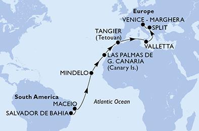| 1. den,Salvador, Brazílie, (připlutí: --:-- | odplutí: 17:00)2. den,Maceio, Brazílie, (připlutí: 10:00 | odplutí: 19:00)3. den,Relaxační den na moři4. den,Relaxační den na moři5. den,Relaxační den na moři6. den,Relaxační den na moři7. den,Mindelo, Sao Vincente, (připlutí: 08:00 | odplutí: 18:00)8. den,Relaxační den na moři9. den,Relaxační den na moři10. den,Las Palmas, Gran Canaria, (připlutí: 07:00 | odplutí: 17:00)11. den,Relaxační den na moři12. den,Tanger, Maroko, (připlutí: 09:00 | odplutí: 18:00)13. den,Relaxační den na moři14. den,Relaxační den na moři15. den,Valletta, Malta, (připlutí: 08:00 | odplutí: 18:00)16. den,Relaxační den na moři17. den,Split, Chorvatsko, (připlutí: 07:00 | odplutí: 16:00)18. den,Marghera (Benátky), Itálie, (připlutí: 08:00 | odplutí: --:--) |