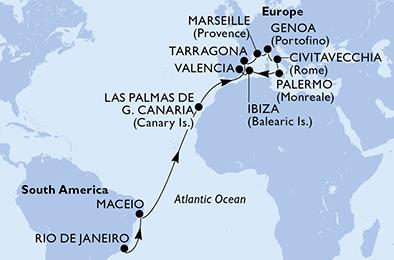 | 1. den,Rio de Janeiro, Brazílie, (připlutí: --:-- | odplutí: 18:00)2. den,Relaxační den na moři3. den,Relaxační den na moři4. den,Maceio, Brazílie, (připlutí: 07:00 | odplutí: 16:00)5. den,Relaxační den na moři6. den,Relaxační den na moři7. den,Relaxační den na moři8. den,Relaxační den na moři9. den,Relaxační den na moři10. den,Relaxační den na moři11. den,Las Palmas, Gran Canaria, (připlutí: 07:00 | odplutí: 17:00)12. den,Relaxační den na moři13. den,Relaxační den na moři14. den,Tarragona, Španělsko, (připlutí: 09:00 | odplutí: 18:00)15. den,Marseille, Francie, (připlutí: 08:00 | odplutí: 17:00)16. den,Janov, Itálie, (připlutí: 08:00 | odplutí: --:--) |