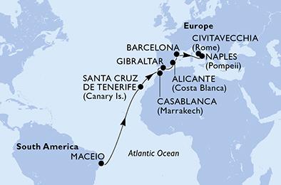 | 1. den,Maceio, Brazílie, (připlutí: --:-- | odplutí: 20:00)2. den,Relaxační den na moři3. den,Relaxační den na moři4. den,Relaxační den na moři5. den,Relaxační den na moři6. den,Relaxační den na moři7. den,Relaxační den na moři8. den,Santa Cruz de Tenerife, Tenerife, (připlutí: 09:00 | odplutí: 18:00)9. den,Relaxační den na moři10. den,Casablanca, Maroko, (připlutí: 06:00 | odplutí: 20:00)11. den,Gibraltar, Velká Británie, (připlutí: 09:00 | odplutí: 15:00)12. den,Alicante, Španělsko, (připlutí: 09:00 | odplutí: 18:00)13. den,Barcelona, Španělsko, (připlutí: 09:00 | odplutí: 19:00)14. den,Relaxační den na moři15. den,Neapol, Itálie, (připlutí: 08:00 | odplutí: 18:00)16. den,Civitavecchia, Itálie, (připlutí: 08:00 | odplutí: --:--) |