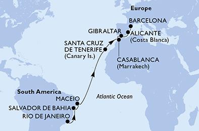 | 1. den,Rio de Janeiro, Brazílie, (připlutí: --:-- | odplutí: 16:00)2. den,Relaxační den na moři3. den,Salvador, Brazílie, (připlutí: 09:00 | odplutí: 18:00)4. den,Maceio, Brazílie, (připlutí: 11:00 | odplutí: 20:00)5. den,Relaxační den na moři6. den,Relaxační den na moři7. den,Relaxační den na moři8. den,Relaxační den na moři9. den,Relaxační den na moři10. den,Relaxační den na moři11. den,Santa Cruz de Tenerife, Tenerife, (připlutí: 09:00 | odplutí: 18:00)12. den,Relaxační den na moři13. den,Casablanca, Maroko, (připlutí: 06:00 | odplutí: 20:00)14. den,Gibraltar, Velká Británie, (připlutí: 09:00 | odplutí: 15:00)15. den,Alicante, Španělsko, (připlutí: 09:00 | odplutí: 18:00)16. den,Barcelona, Španělsko, (připlutí: 09:00 | odplutí: --:--) |
