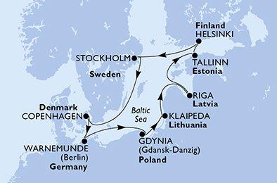 | 1. den,Kodaň, Dánsko, (připlutí: --:-- | odplutí: 18:00)2. den,Warnemünde, Německo, (připlutí: 07:00 | odplutí: 17:00)3. den,Gdyně, Polsko, (připlutí: 10:00 | odplutí: 18:00)4. den,Klaipeda, Litva, (připlutí: 07:00 | odplutí: 15:00)5. den,Riga, Lotyšsko, (připlutí: 07:00 | odplutí: 15:00)6. den,Tallinn, Estonsko, (připlutí: 09:00 | odplutí: 18:00)7. den,Helsinky, Finsko, (připlutí: 08:00 | odplutí: 18:00)8. den,Stockholm, Švédsko, (připlutí: 09:00 | odplutí: 23:59)9. den,Stockholm, Švédsko, (připlutí: 00:01 | odplutí: 16:00)10. den,Relaxační den na moři11. den,Kodaň, Dánsko, (připlutí: 08:00 | odplutí: --:--) |
