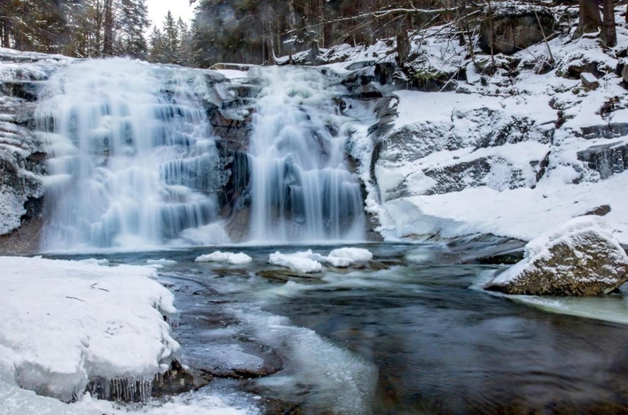 jezera, kde se ve studeném světle třpytí ledové krystalky
