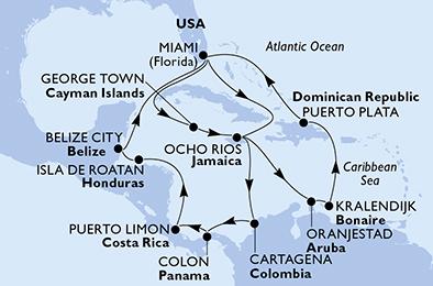 USA, Kajmanské ostrovy, Jamajka, Aruba, Bonaire, Dominikánská republika, Kolumbie, Panama, Kostarika, Honduras, Belize z Miami na lodi MSC Poesia