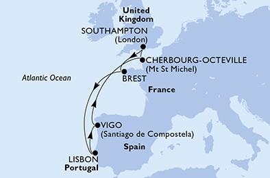 Velká Británie, Francie, Portugalsko, Španělsko ze Southamptonu na lodi MSC Meraviglia