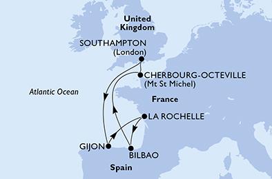 | 1. den,Southampton, Velká Británie, (připlutí: --:-- | odplutí: 20:00)2. den,Relaxační den na moři3. den,Gijón, Španělsko, (připlutí: 07:00 | odplutí: 17:00)4. den,La Rochelle (Bordeaux), Francie, (připlutí: 09:00 | odplutí: 19:00)5. den,Bilbao, Španělsko, (připlutí: 09:00 | odplutí: 19:00)6. den,Relaxační den na moři7. den,Cherbourg , Francie, (připlutí: 07:00 | odplutí: 19:00)8. den,Southampton, Velká Británie, (připlutí: 07:00 | odplutí: --:--) |